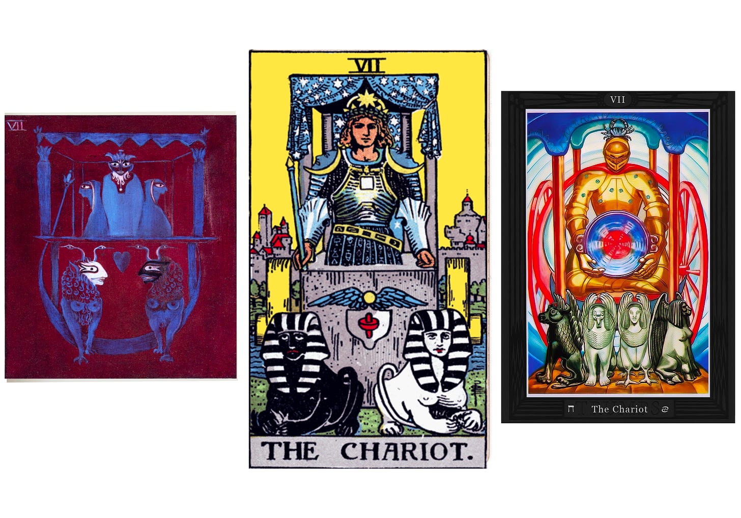 Chariot Card Depictions by Leonora Carrington, “Pixie” Pamela Coleman Smith, and Lady Frieda Harris