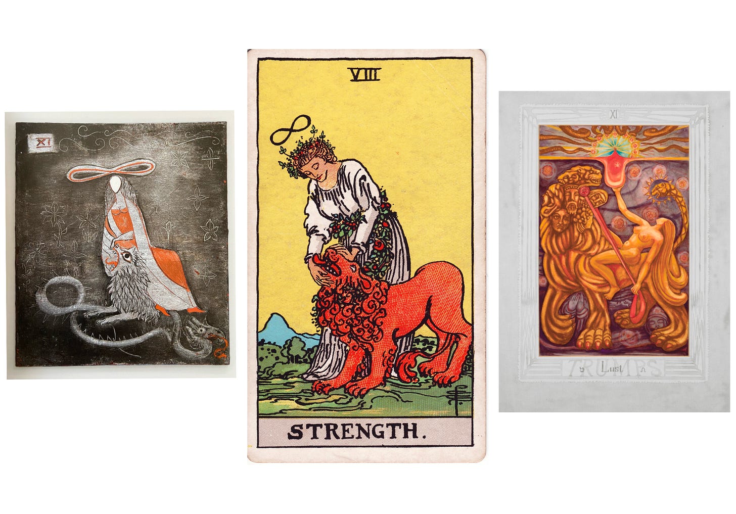 Strength Card Depictions by Leonora Carrington, “Pixie” Pamela Coleman Smith, and Lady Frieda Harris